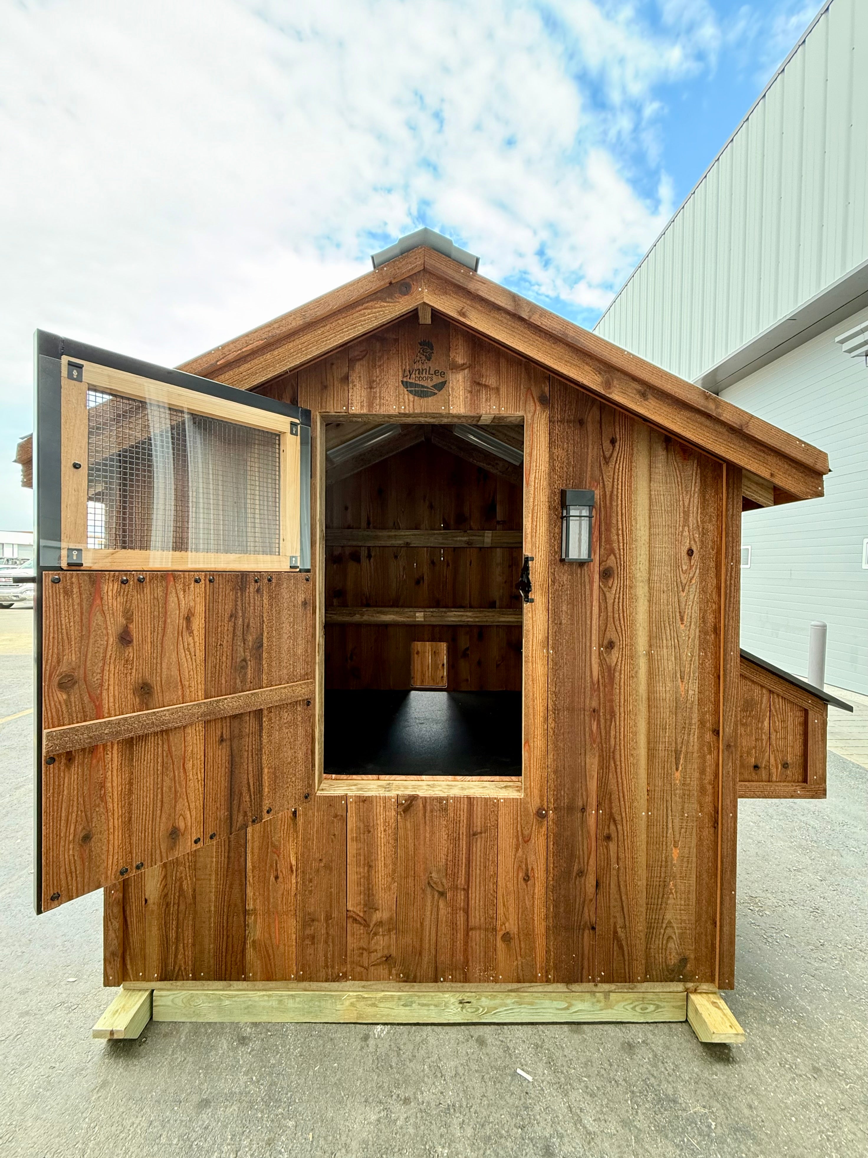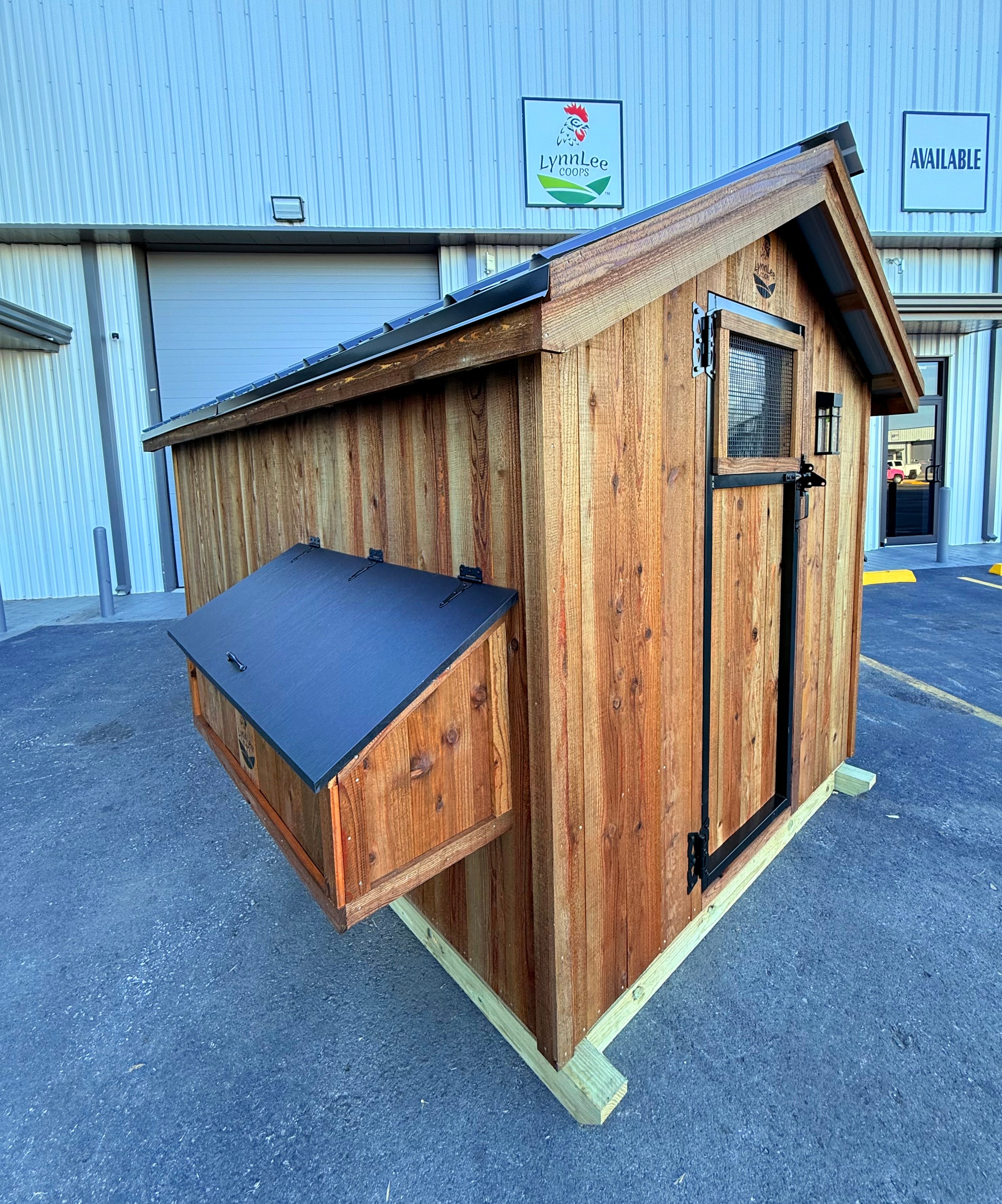 - Materials: kiln-dried cedar siding and trim, pressure-treated frame with integrated 4×4 skids, 16GA black PVC-coated welded wire, and a durable black metal roof.